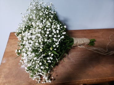 This simple rustic bouquet has blooms of Baby's Breath and touches of aster. Handheld with hemp twine wrapped around the stems, this is a beautiful presentation or wedding bouquet.